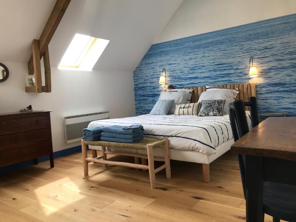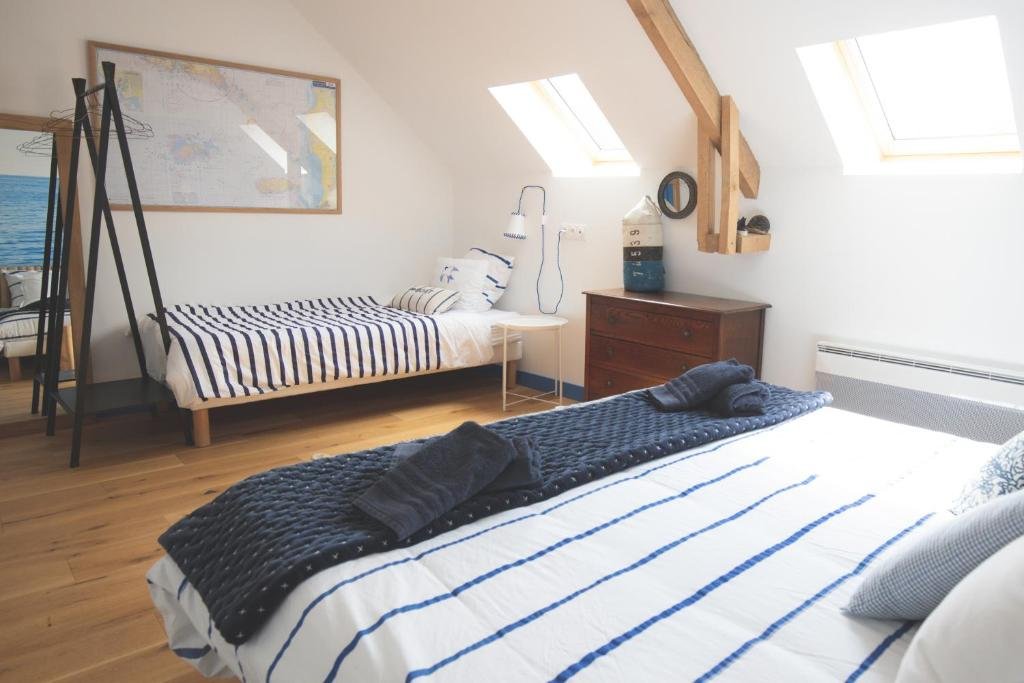 La chambre Mer, au premier étage, peut accueillir trois personnes avec ses trois lits en 90/200.Je peux les disposer en un grand lit double et un lit simple, ou en trois lits simples. Merci de me le préciser lors de la réservation. Un petit bureau et une commode agrémentent cette chambre aux tons bleus. Vous disposez d’une salle de bain équipée d’une douche et de wc privés. Fermez les yeux et vous entendrez le bruit des vagues ….