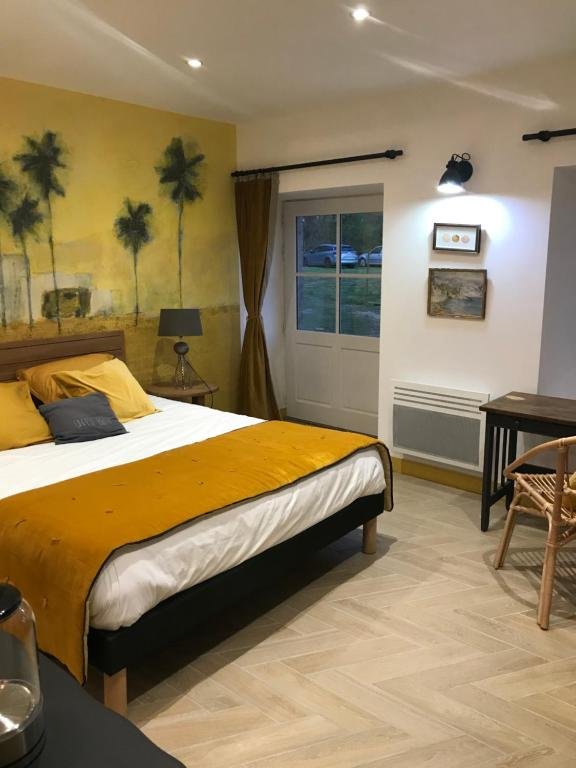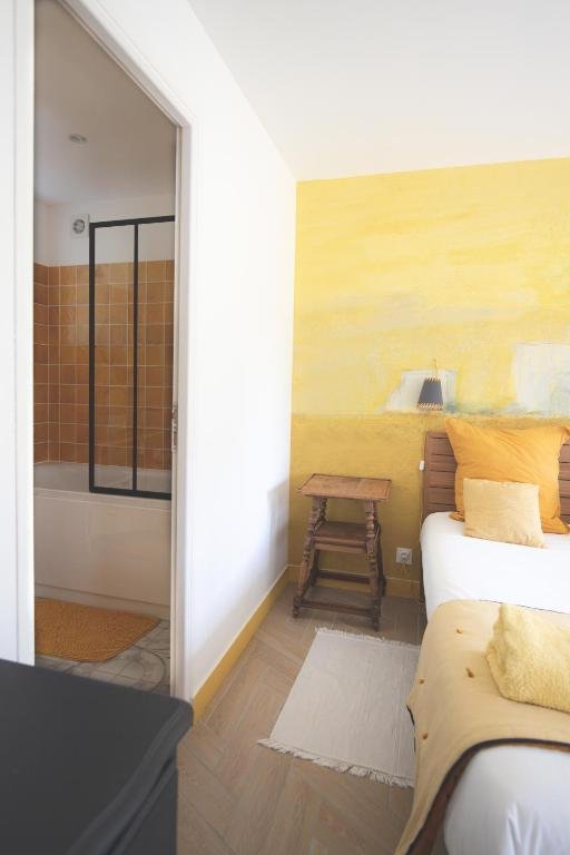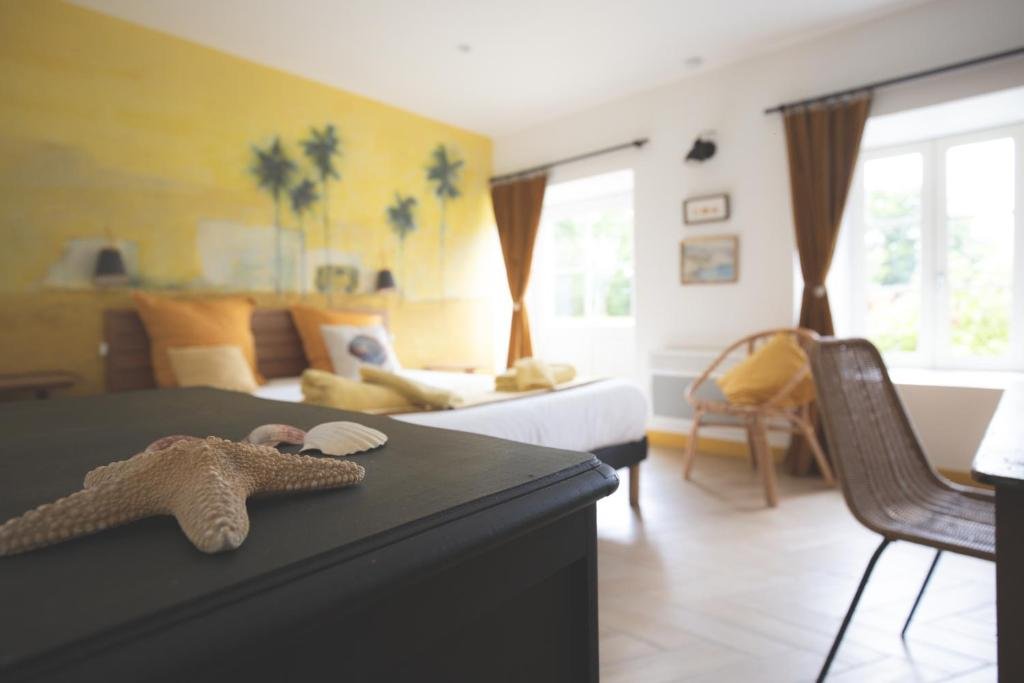 La Chambre Plage, dans les tons jaunes, est au rez de chaussée. Elle est accessible par le jardin ou par la maison. Cette chambre est équipée d’un lit double en 160/200, d’un petit bureau et d’une commode. La Salle de bain dispose d’une baignoire, de deux lavabos et de toilettes privés.